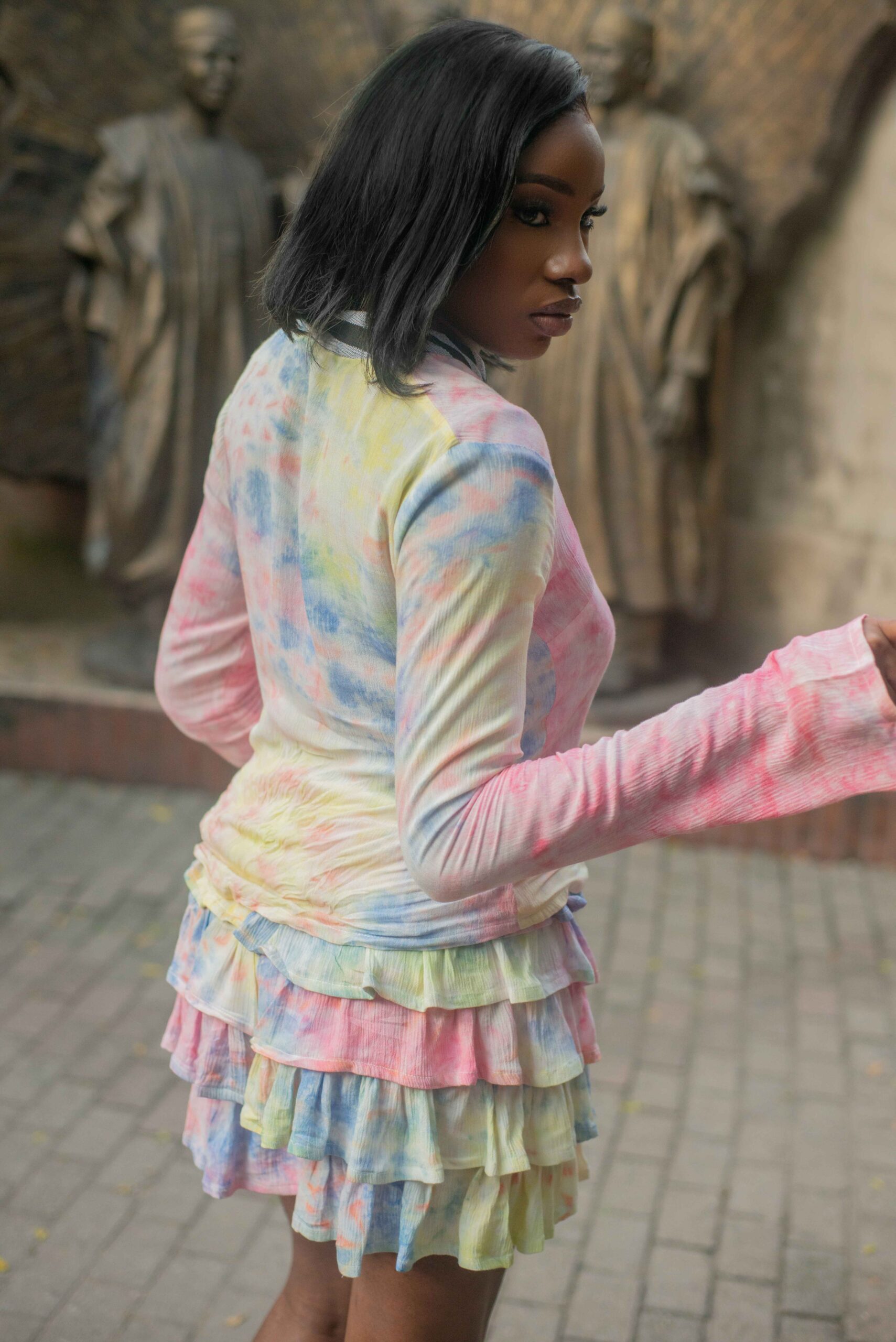 A playful two-piece made in luxe chiffon Adire with beaded LS/01 emblem, hem flared sleeves and multi-layered ruffled skort(an actual pair of shorts,intentionally made to semble a skirt). Feminine, flirty and utterly chic.