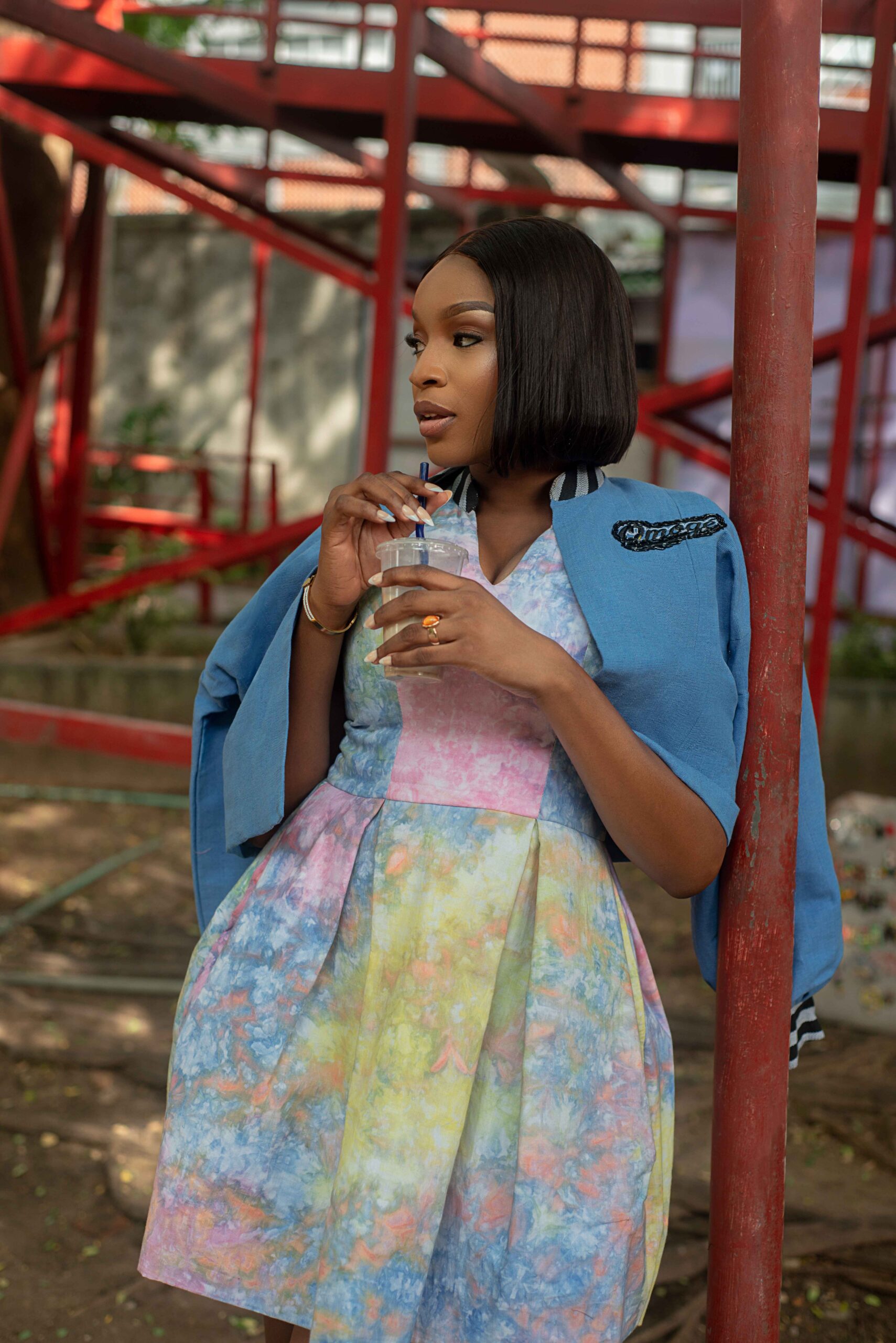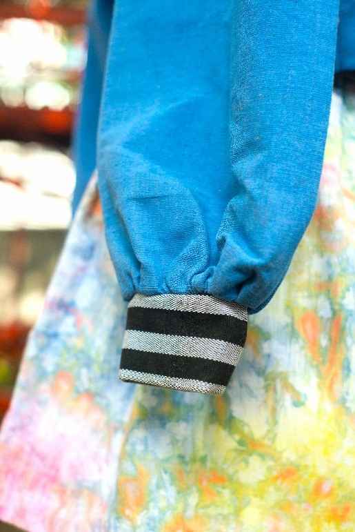 A crop-length Asooké bumper jacket with black/white signature varsity cuffs and Omoge embroidery. Softly structured with exaggerated sleeves. No closure.