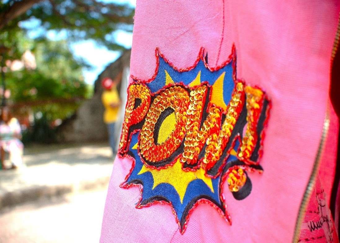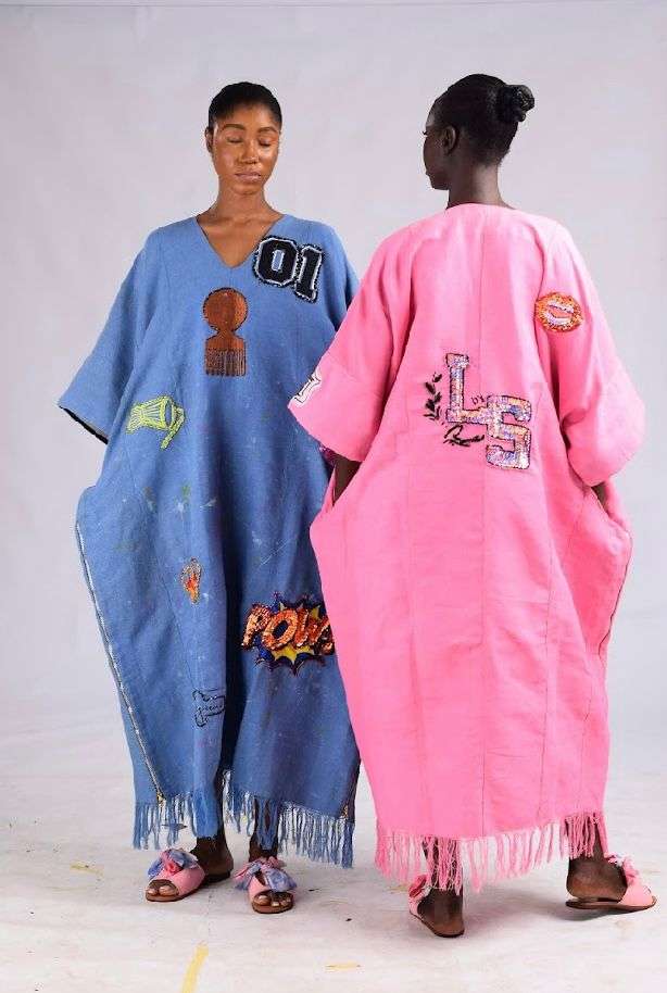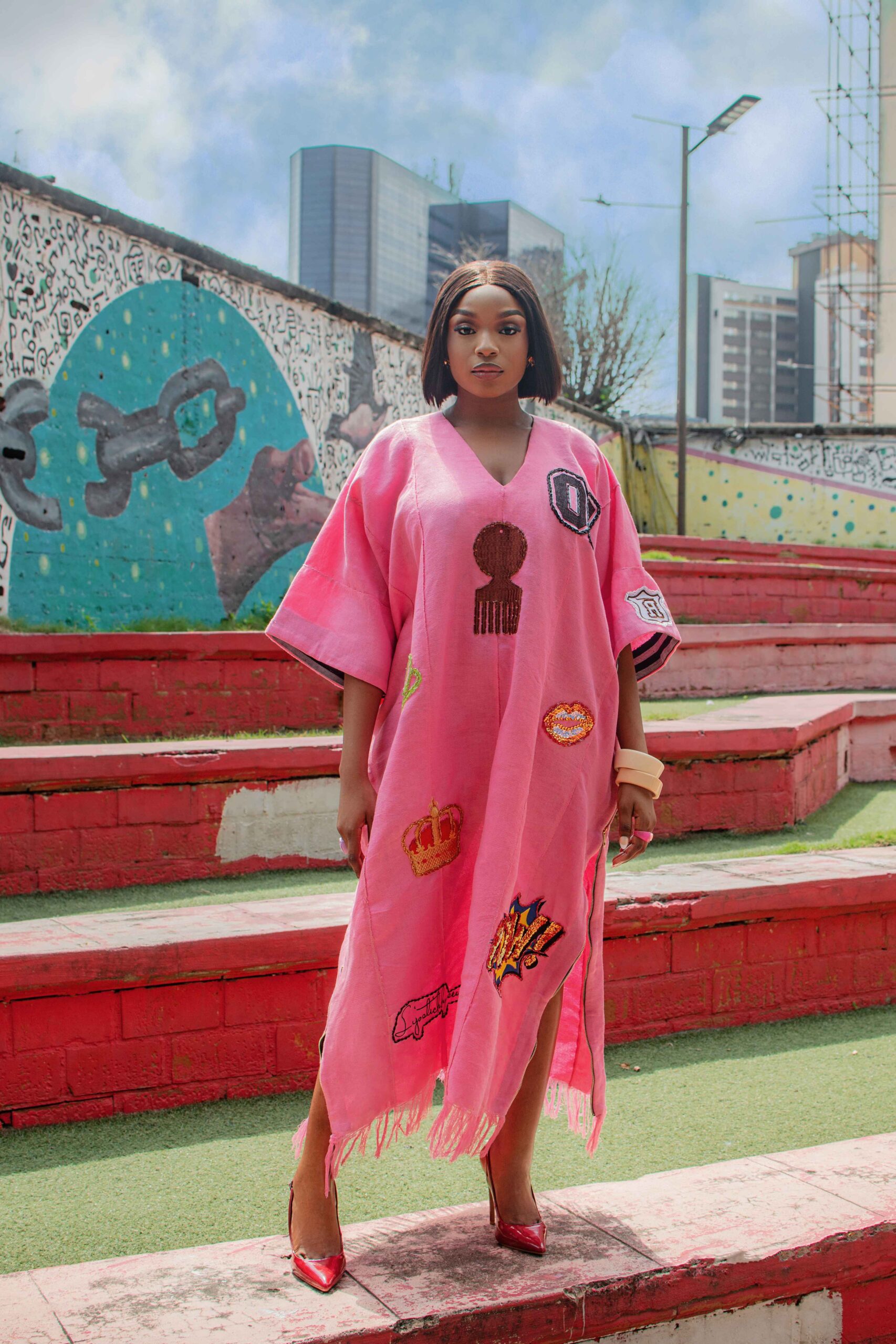 Handwoven Asooké meets intricate embroidery.POW!, 01, African comb, lip,talking drum, crown and LS…finished with artisanal beading and tasselsed hem. It is a free boubou silhouette with a v-neckline. The boubou is ankle length on tall and full length on petite. Has delicate beads and sequins on it.Black and white inner tapings created with asooke to mimic signature black and white details on varsity jackets